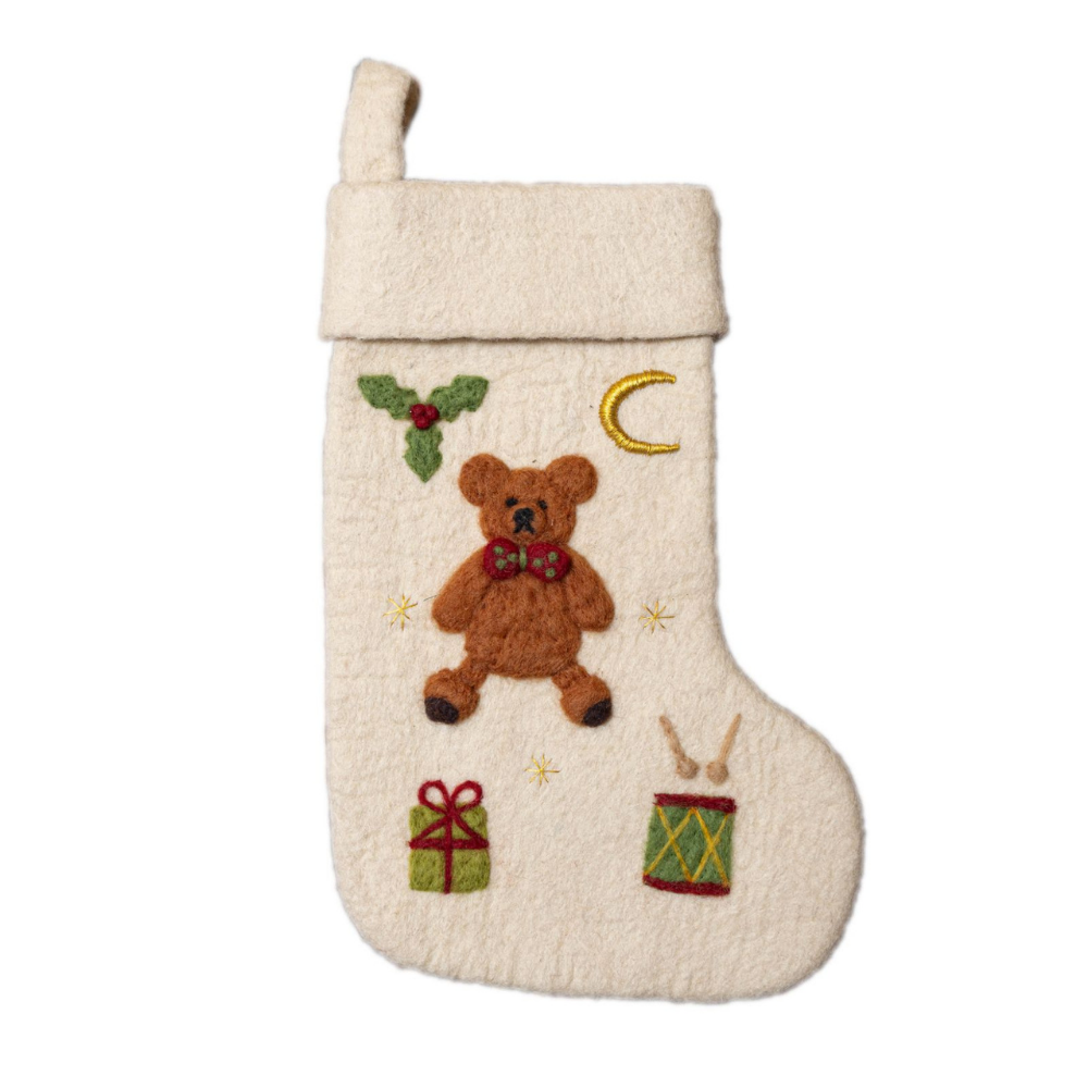 A FULLY hand-crafted new design. Introducing our Embroidered Holiday Stocking, a truly special addition to your festive decor. This stocking features a meticulously crafted teddy bear that any child will adore.