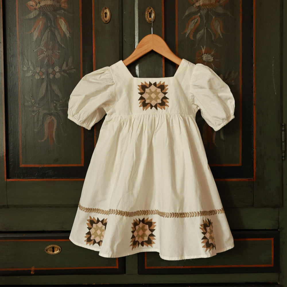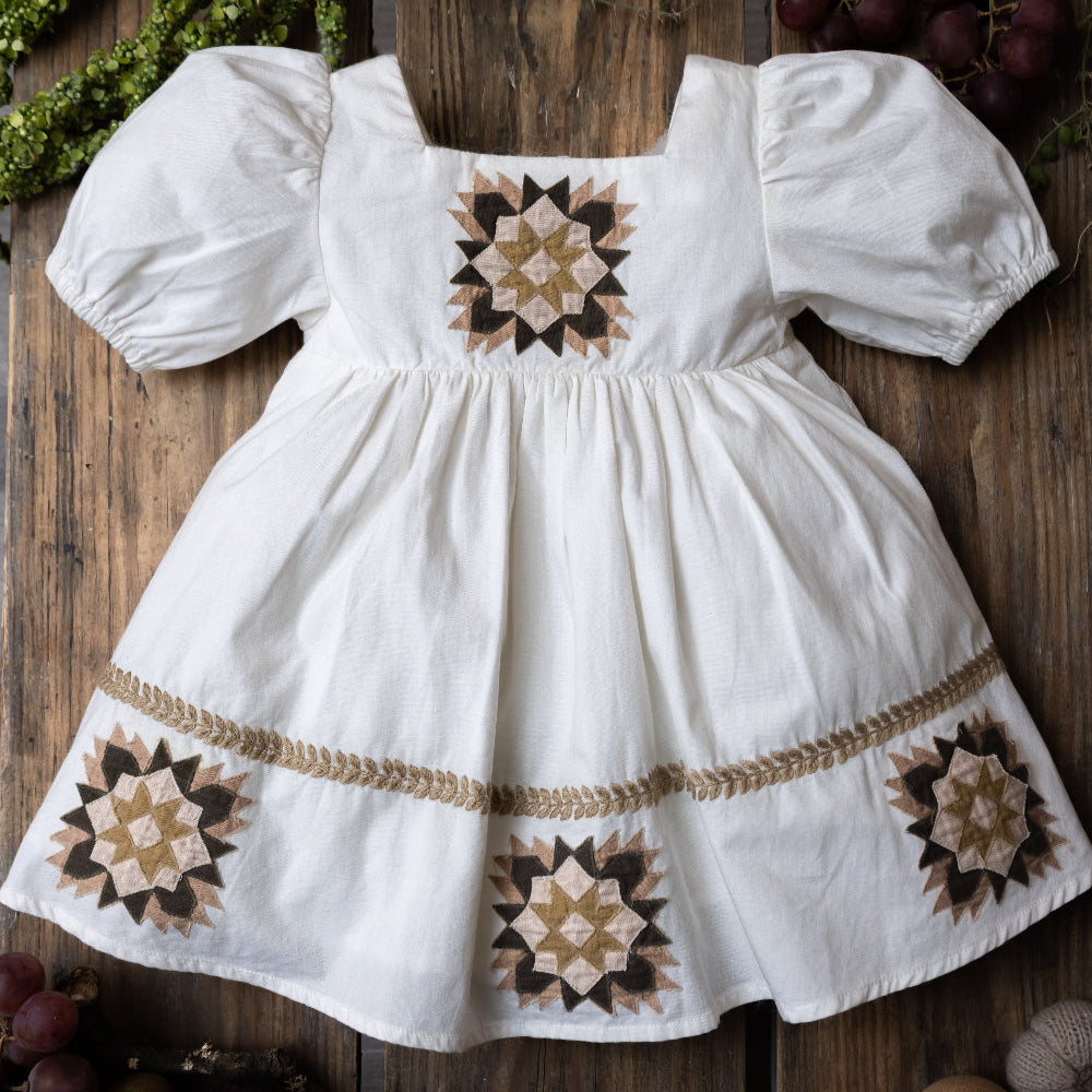 This beautiful dress is a celebration of artistry and tradition, featuring exquisite patchwork motifs inspired by timeless quilt designs. The intricate patterns are paired with a soft, flowing silhouette, creating a look that's as unique as it is elegant. The puff sleeves add a vintage touch, while the earthy tones in the embroidery bring warmth and charm.