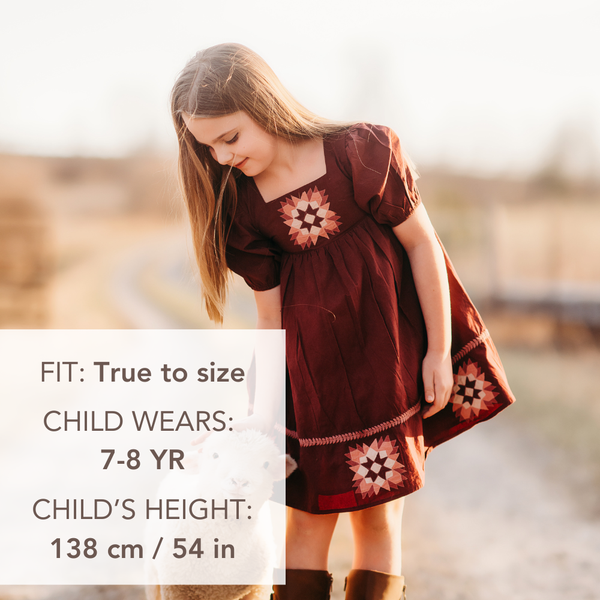 This beautiful dress is a celebration of artistry and tradition, featuring exquisite patchwork motifs inspired by timeless quilt designs. The intricate patterns are paired with a soft, flowing silhouette, creating a look that's as unique as it is elegant. The puff sleeves add a vintage touch, while the earthy tones in the embroidery bring warmth and charm.