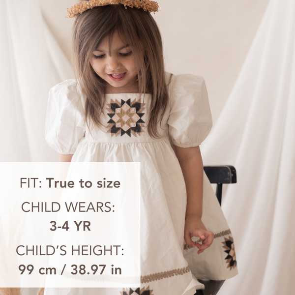 This beautiful dress is a celebration of artistry and tradition, featuring exquisite patchwork motifs inspired by timeless quilt designs. The intricate patterns are paired with a soft, flowing silhouette, creating a look that's as unique as it is elegant. The puff sleeves add a vintage touch, while the earthy tones in the embroidery bring warmth and charm.