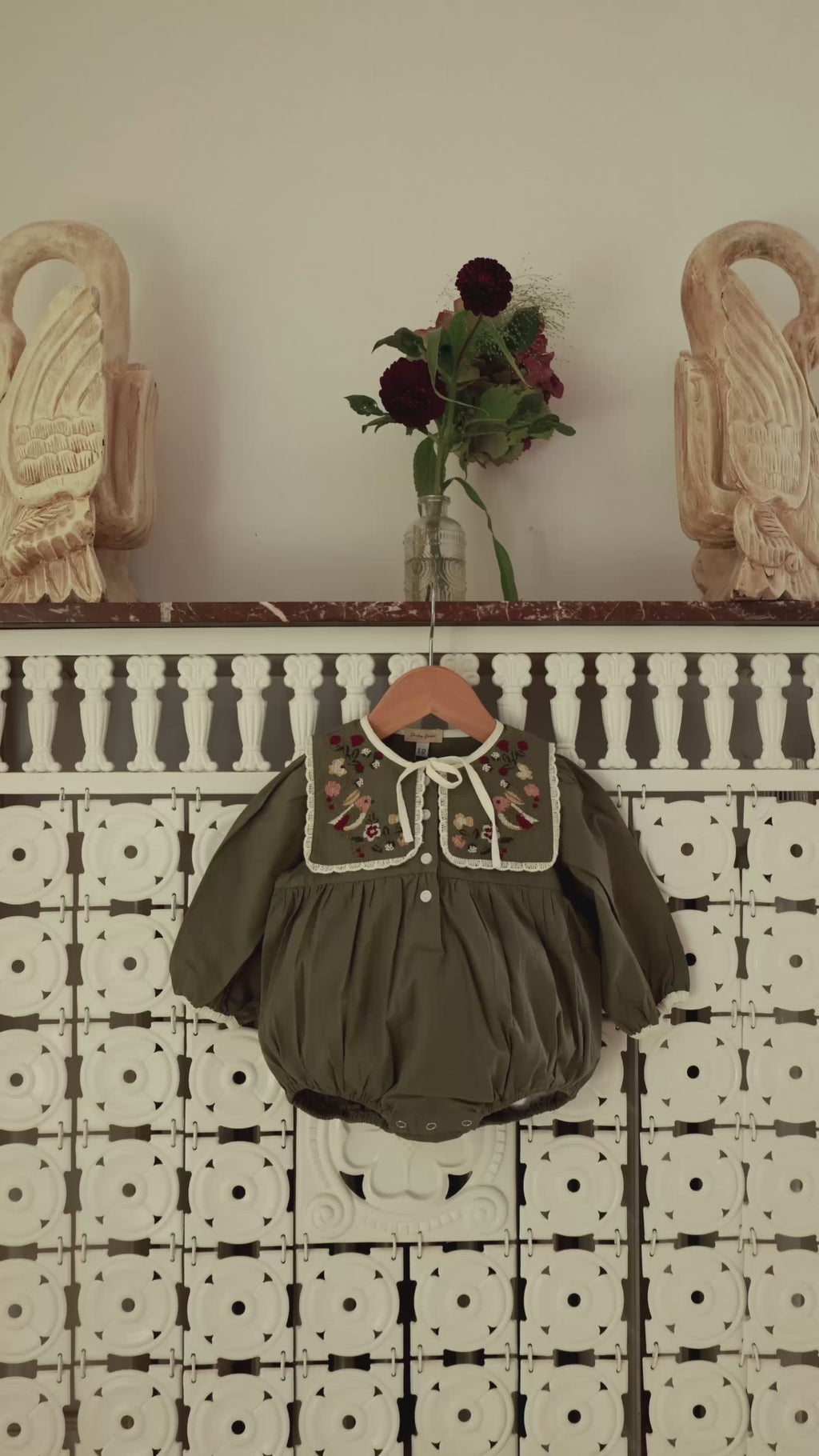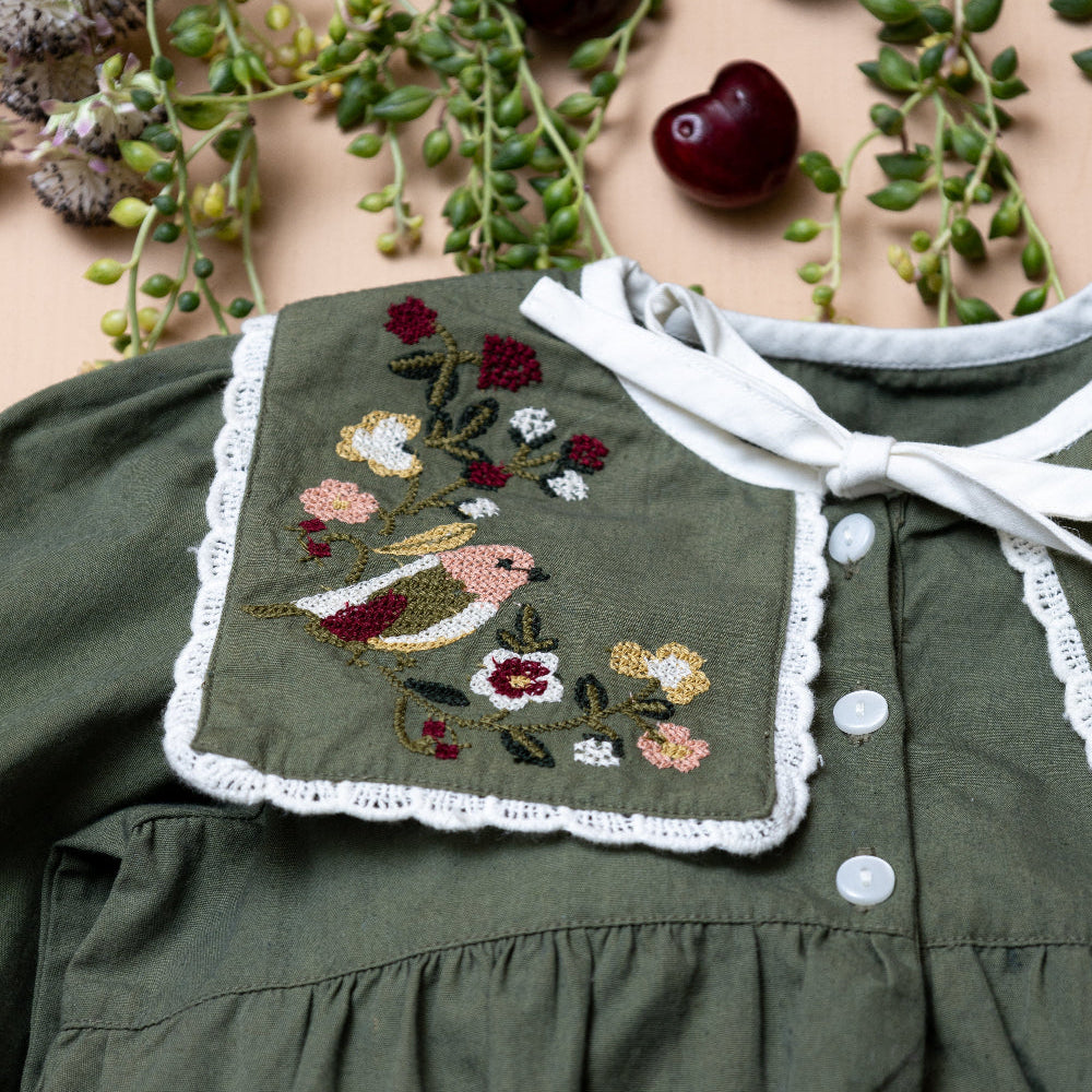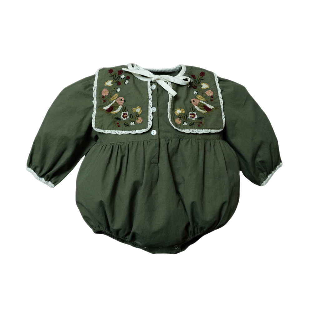 This delightful romper combines timeless charm with everyday comfort. Featuring a generously sized collar adorned with intricate embroidery of birds and floral motifs, it brings a touch of nature's beauty to your little one's wardrobe.