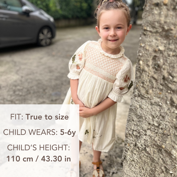 Our new Blossom Breeze dress is special because it combines classic charm with modern style. Featuring an intricately embroidered flowers, adorable puff sleeves, a perfect fit, it's a delightful blend of elegance and comfort for your little one's wardrobe.