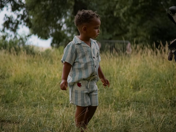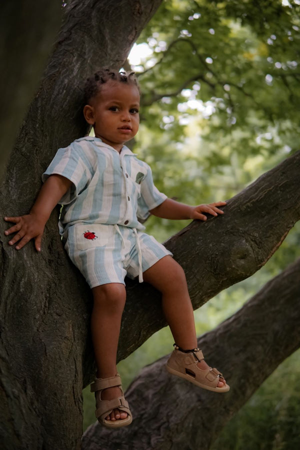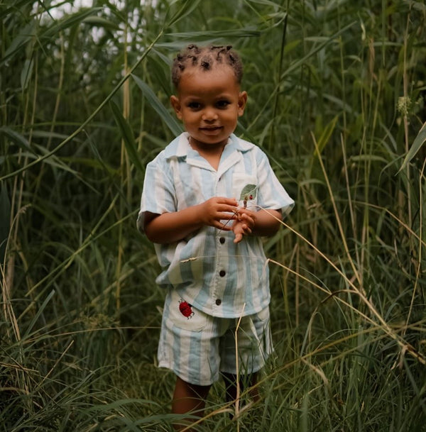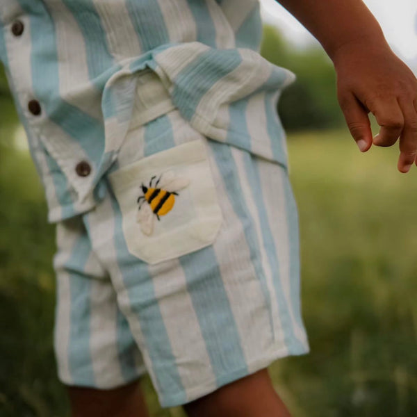 Dress your little one in playful style with our adorable set of buttoned shirt and shorts, boasting blue and white stripes and sweetly embroidered ladybugs and bees on the pockets. Perfect for adding a touch of whimsy to their wardrobe adventures.
