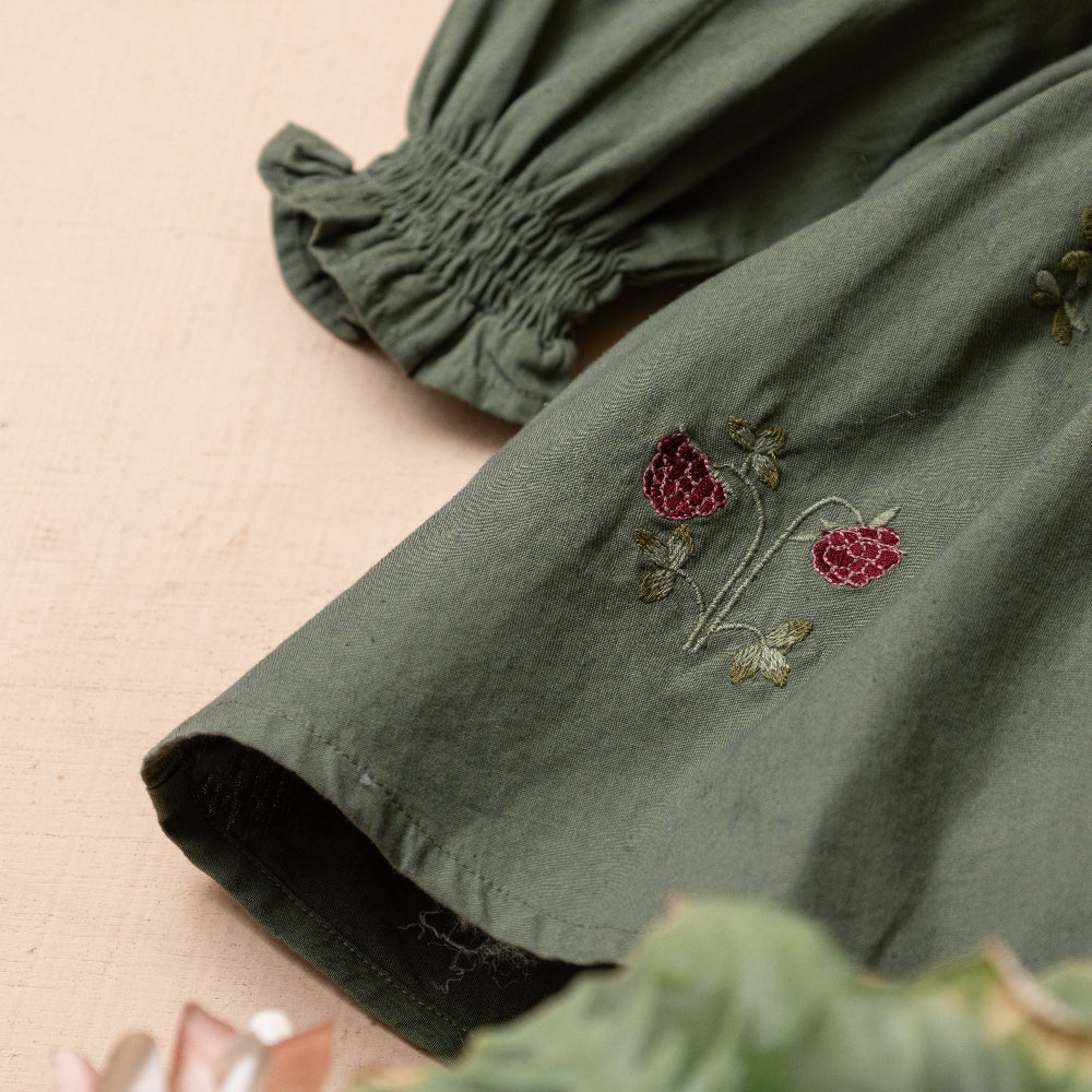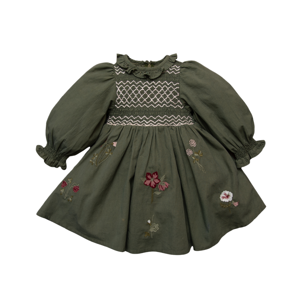 Continue shoppingThis enchanting dress for kids is a masterpiece of craftsmanship, featuring intricate smock work adorned with delicate flower and raspberry motifs. The embroidery is beautifully detailed, adding a whimsical charm to every stitch.
